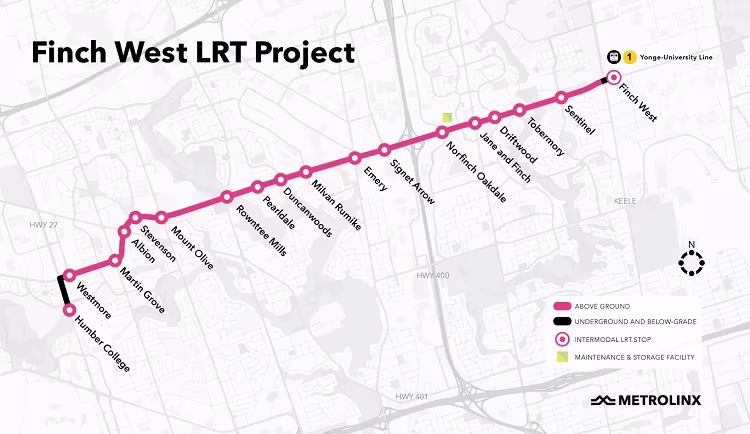 Metrolinx and the TTC have announced that the long overdue Toronto Finch West LRT (Line 6) will open for revenue service on December 7, 2025. It will be Toronto’s first new rail line since 2002. The line runs largely above-ground in the median of Finch Ave. from Finch West subway station to Humber College, a distance of 11 km. There are 18 stops (16 at grade). Finch Ave. was widened as needed to maintain at least 2 general-purpose traffic lanes in each direction, plus cycling lanes. A maintenance and storage facility was also constructed.